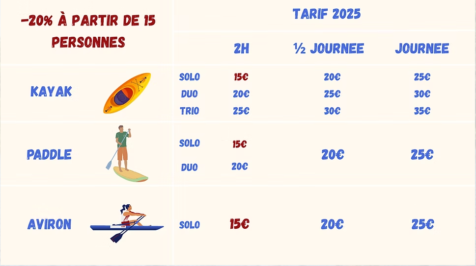 Tarif : 20€ par personne uniquement sur des embarcations duos ou trios + 5€ par personne pour la visite guidée du Château de la Roche